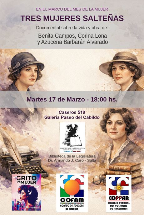 17/03/26 - 18 Hs. Con motivo del mes de la Mujer - DOCUMENTALES EN LA BIBLIOTECA - "TRES MUJERES SALTEÑAS" Una producción de EDI-Salta. Vida y Obra de Benita Campos, Corina Lona y Azudena Barbarán Alvarado.