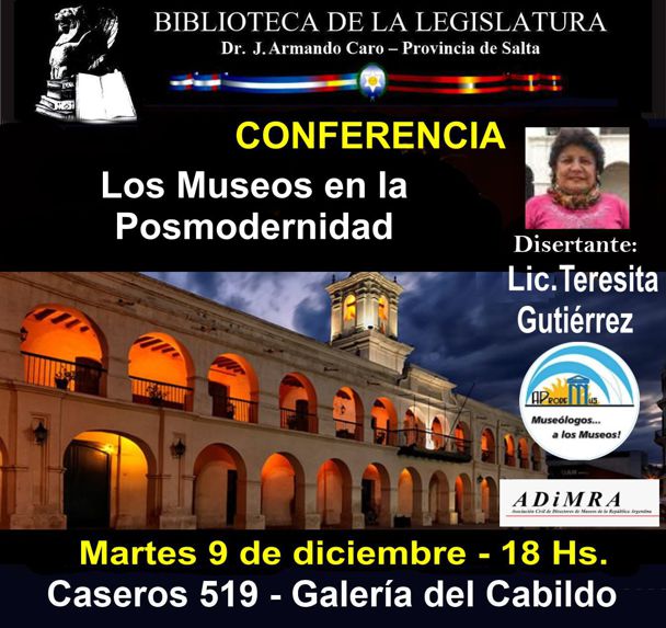 - 09/12/25 – 18,00 Hs. CONFERENCIA “LOS MUSEOS EN LA POSMODERNIDAD” Por Teresita Gutiérrez. Museóloga del Cabildo (Museo Histórico del Norte).